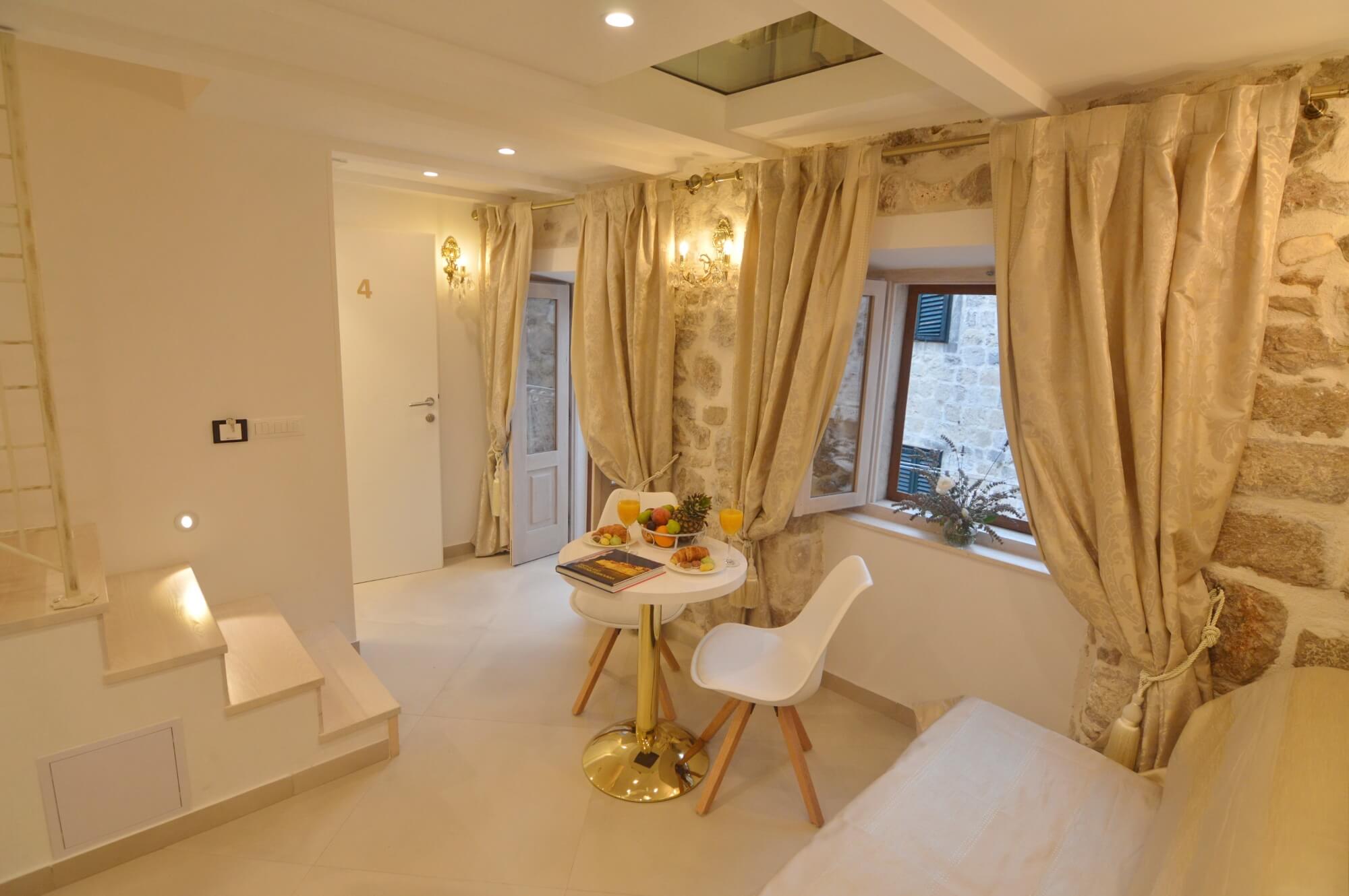 Newly renovated luxury apartment situated on the ground floor of the Villa. Carefully decorated with a combination of natural stone shades that elegantly overlap with the colors of old gold made to be your oasis of peace. Kitchenette, bedroom (1 large double bed – can be 2 separate beds), private bathroom, all equipped with everything you need. Enjoy beautiful cliff beach (Buža bar), with refreshing drinks only 1 minute from the apartment.
